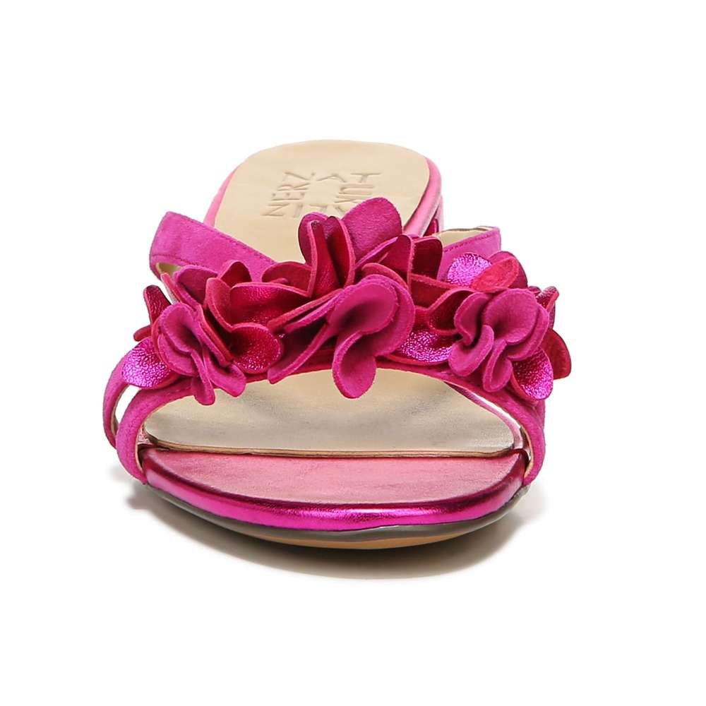 • Dressy slide sandal with floral details.