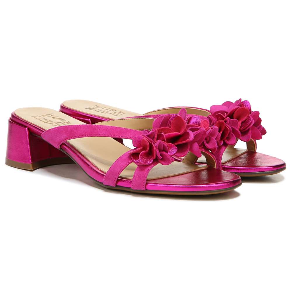 Embrace all things floral this season with a slide sandal featuring a walkable heel.