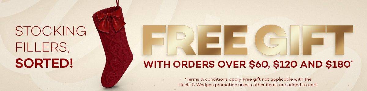 Must spend minimum $60. Free Gift does not combine with the Heels & Wedges promotion unless other items are added to cart. Must add the Gift in the Minicart or Cart Page.