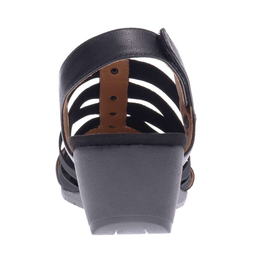 With an eye-catching elastic upper and beautiful leather floral details, Bari is a strappy sensation that is both polished and feminine. Perfect for a night out or a wedding weekend, this ultra-comfortable wedge stands up to any stiletto in both look and feel.